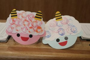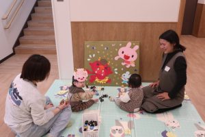 2家庭が参加で始まりました。初めに「鬼のパンツ」の絵本を見ながら歌を歌い、鬼のお面を作りました。