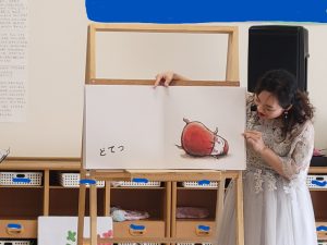 前半の乳児の部には、南いくた保育園の0歳児から2歳児と一緒に、提携している保育室みによんさんのお友だちと地域の方3名も参加しました。「さんぽ」から始まり、絵本「だるまさんが」と「おべんとうばこのうた」 「できるかな?あたまのさきからつまさきまで」を見て、最後にアンコールの「はたらくくるま」を聴きました。